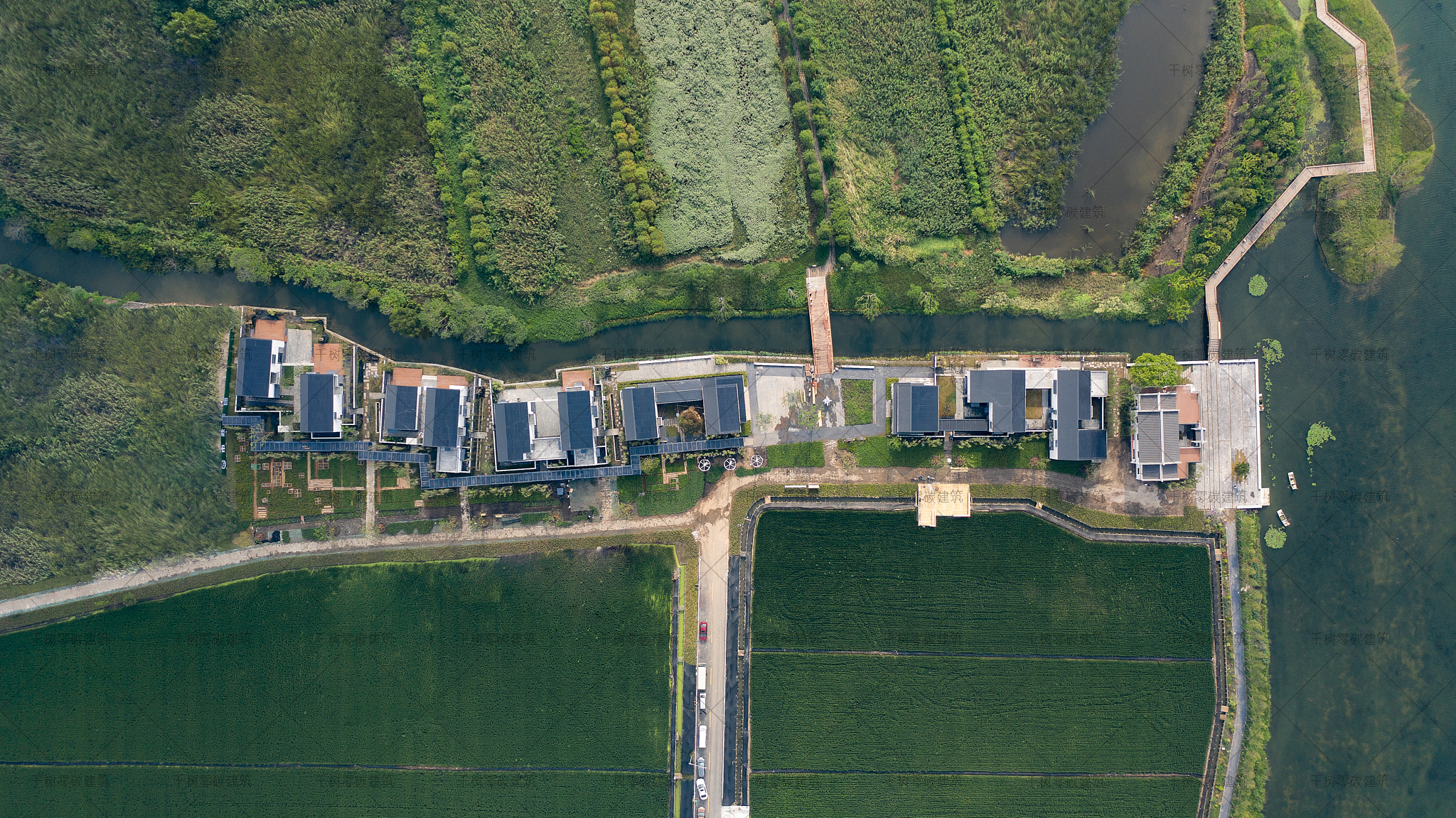 竹小汇科创聚落是全国首个零碳聚落样板示范点,其中办公组团一、办公组团二、办公组团三、办公组团四、办公组团五和访问楼为超低能耗建筑、报告厅木屋为实时零碳建筑;展示中心木屋为全生命周期零碳建筑。