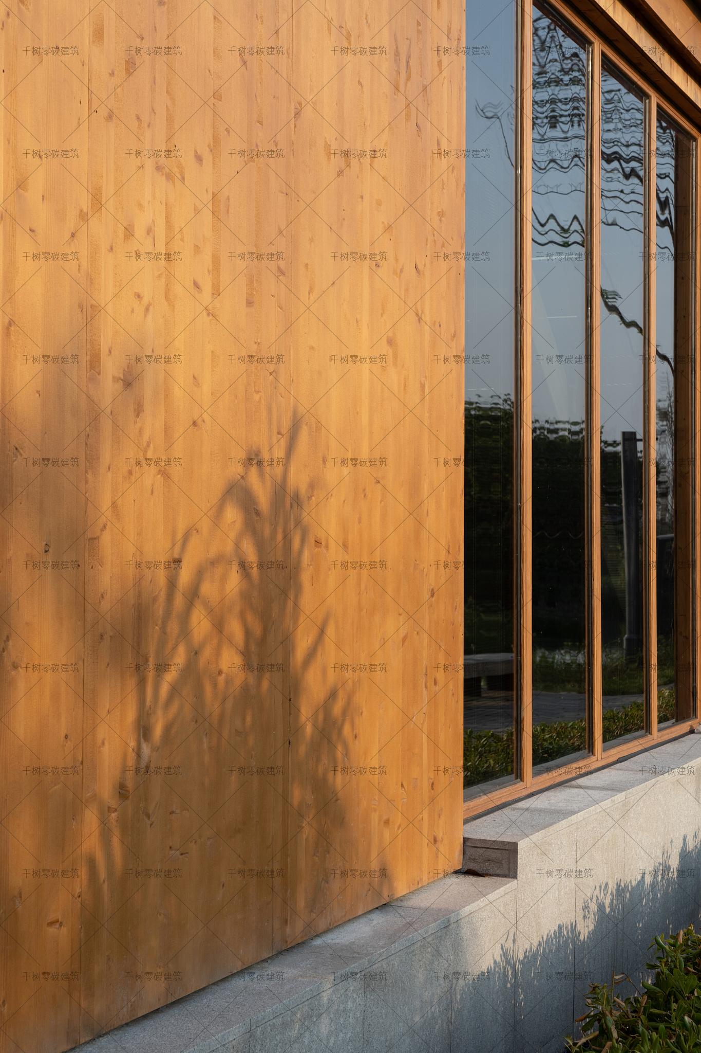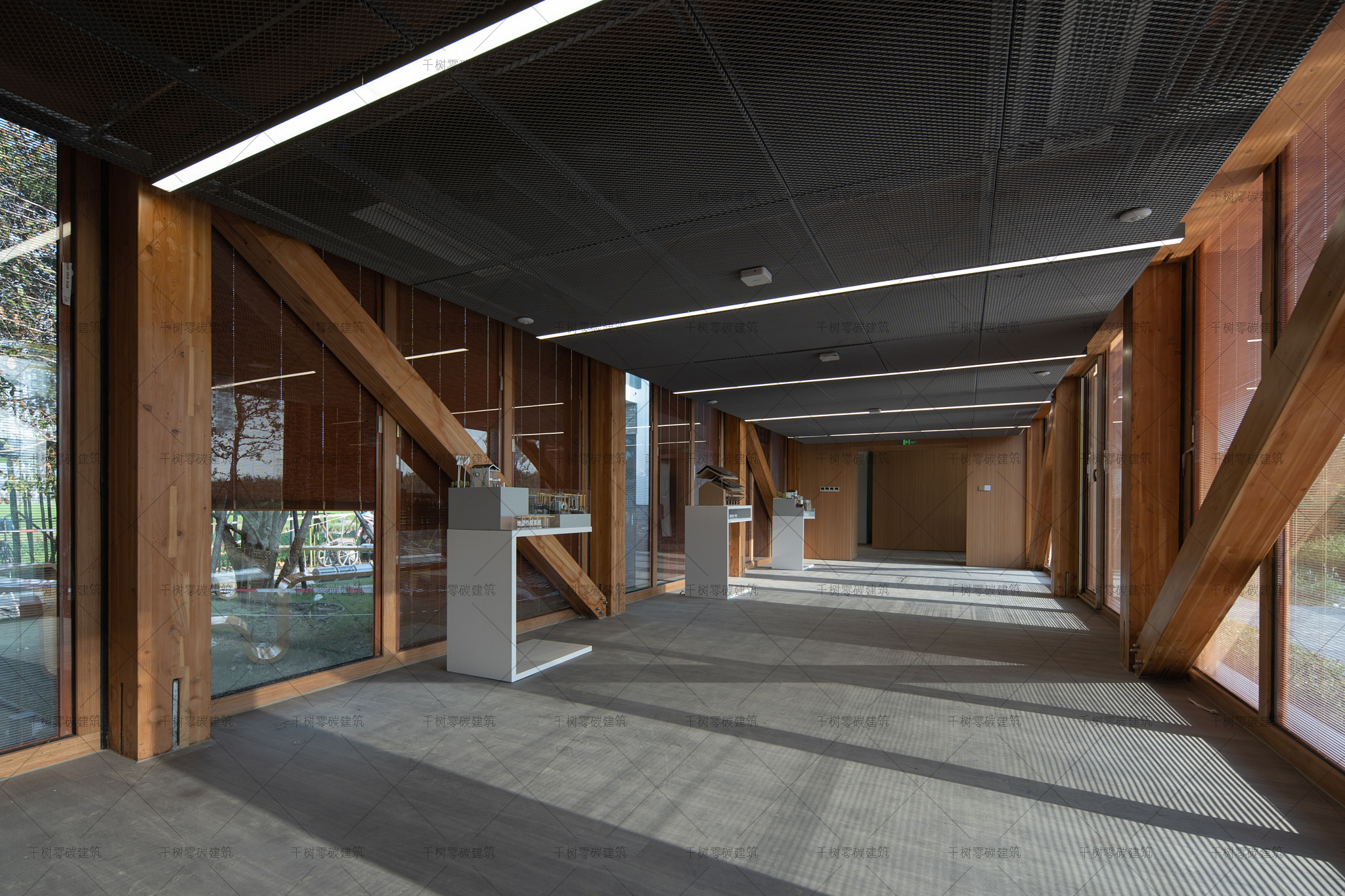 报告厅木屋和展示中心木屋墙面采用隔气膜+内外双层保温(内保温184mm厚,外保温70mm厚)+CLT正交胶合木饰面板,屋面采用隔气膜+保温(屋面保温235mm厚)+光伏瓦的围护结构,门窗采用被动式节能阻燃木门窗(内置遮阳百叶),加上高能效的技术设备:地源热泵系统、风力发电系统、建筑光伏一体化系统、光储直柔系统、热回收系统,通过可视化的智慧运维管理平台高效监管、智慧运算,综合管控与整治,最终实现了零碳建筑的目标。