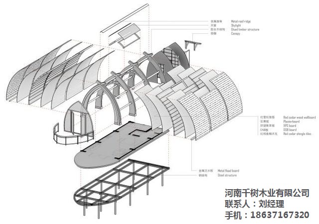 拱形的船身结构,由四组三铰拱木拱梁通过五根圆木连接为整体,每组三铰拱由左右两个对称半拱吊装拼接,而每个半拱又由两道十一公分宽的北美花旗松胶合拱梁组合成,拱顶的小交叉真实反应拱结构的对接特征。采用三铰拱的形式,避免了木材因过度弯曲而产生超限的应力。整个屋面系统保持在拱梁的厚度之中,内部红雪松挂板使用水性清漆保持原木纹理和触感,外部使用了三种尺寸的红雪松木瓦上下微错的铺装方式,质感自然。