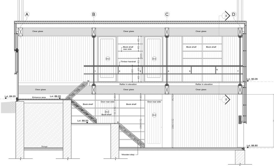 4个14.50 m跨度的sal木框架由多个胶合木板和薄钢拉杆组成,支撑着整个用木材覆盖的屋顶、隔热的建筑外壳、整个木质的夹层,并塑造了标志性的双层玻璃天窗。整个房子被悬挂在这些坚固的桁架框架中,没有任何中间柱的支撑,使得一种不受干扰的地形轮廓流进入静谧的松木镶板的室内空间。精心雕琢的方形窗户,朝向各个方向,让使用者得以禅观各个山峰和不断变化的云。