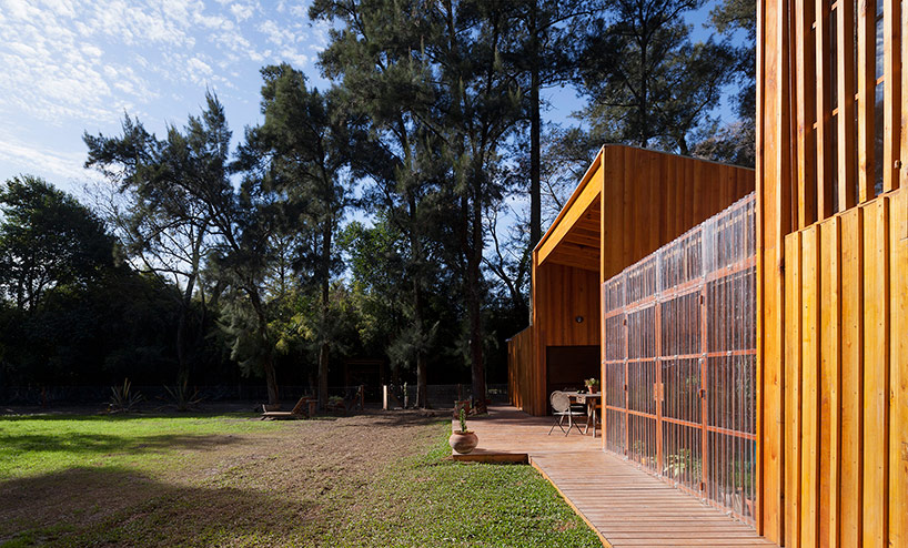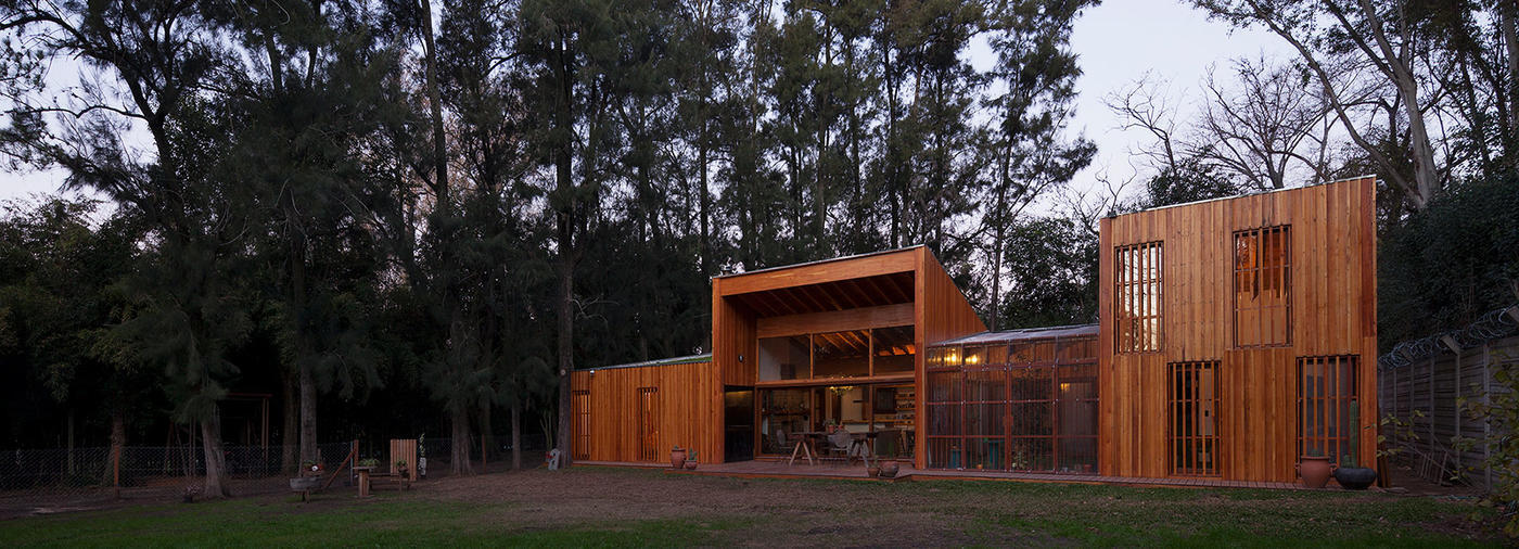 阿根廷建筑事务所IR arquitectura与我们分享的项目,是位于阿根廷布宜诺斯艾利斯(Buenos Aires)郊外托尔图吉塔斯市(Tortuguitas)的 Casa Aa节能住宅。在这个养育着孩子的家庭住宅,家里明确地划分出大人与小孩间的分隔,同时又融入树木茂盛的场地环境中,拥有进行室外活动的空间和充沛的阳光。波浪状聚碳酸酯屋顶覆盖下的半室外绿色庭院是个温室和有顶花园空间,并与位于中心位置的矩形起居空间相邻。共享的起居区和主卧拥有朝北最高的洞口,使能照射到的阳光最大化,而建筑的外部形态因此被分割成四部分。上下交替的倾斜绿色屋顶提供了一个很好的天然热绝缘体,还有助于替换建筑所占据的自然地被。
