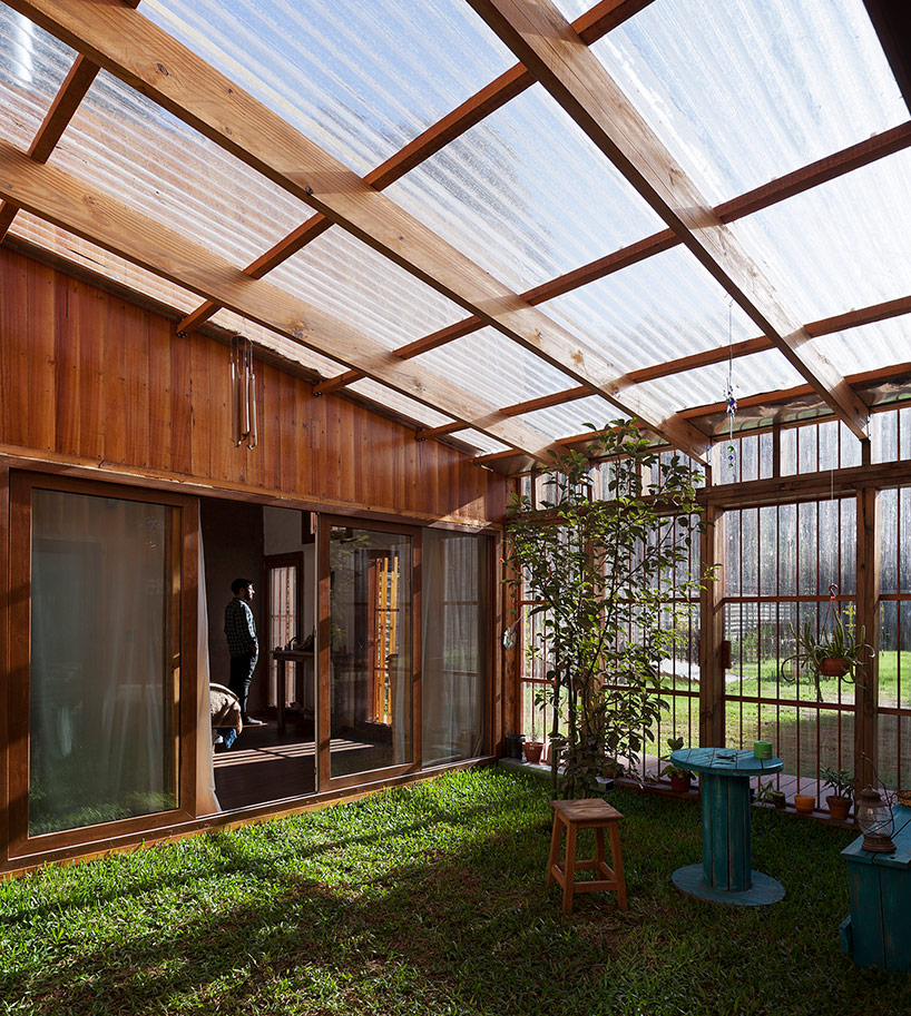 穿插在住宅当中的绿色庭院,通向起居空间、办公空间和主卧。