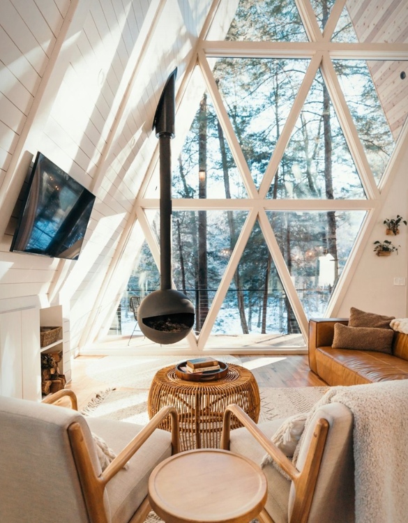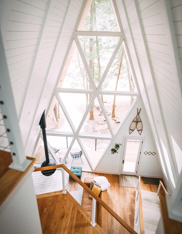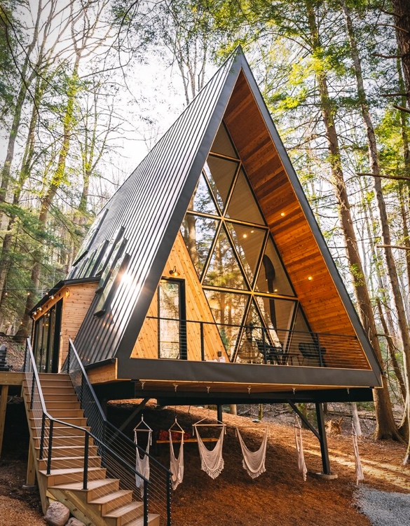 装配式三角形木屋民宿:采用先进的装配技术,将三角形木屋模块化设计,方便运输和组装。内部设施齐全,提供舒适的住宿体验。