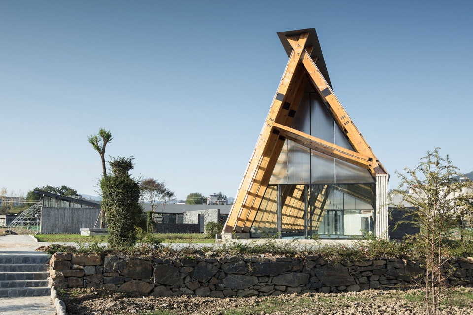 在竹溪县龙坝镇,一条新的市政道路“长龙大道”以30度的切角与原有乡镇的的主入口交叉而过,在与原有乡镇的主干道之间的三角形地块,便是草莓园活动馆和采摘园的用地。龙坝镇政府希望以草莓的培育,采摘以及相关体验活动,作为龙坝镇田园经济的新起点,在新老道路的交叉口,形成乡村活力的切入点。