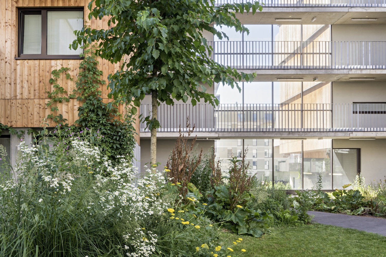 各个部分通过三排南北方向的通道平台相互连接。这三条流通路线通过一系列采光楼梯、内部走廊和开放的通道平台,提供了不同的空间体验。串行的线性基本结构为布置不同类型的公寓提供了极大的灵活性,因此允许居民的交流。公寓平面图的设计非常灵活。它们可以在以后以各种方式改变。尽管它们有一个很好的能源平衡,但建筑仍然向外开放。结合使用木材作为建筑材料,使整个建筑群既轻盈又有深度。