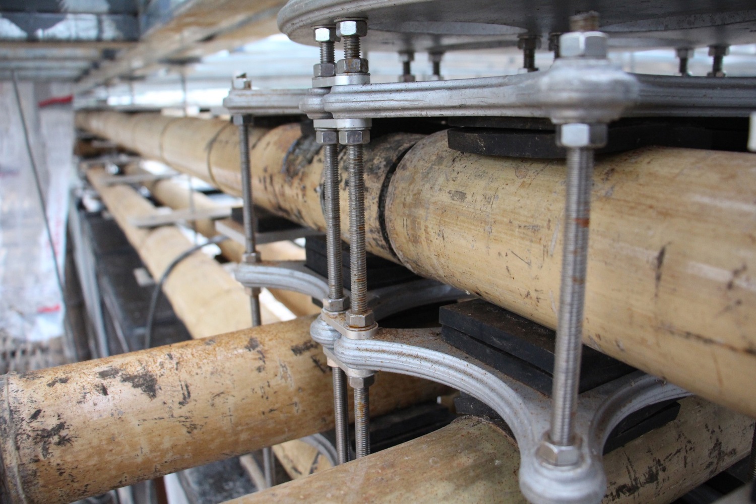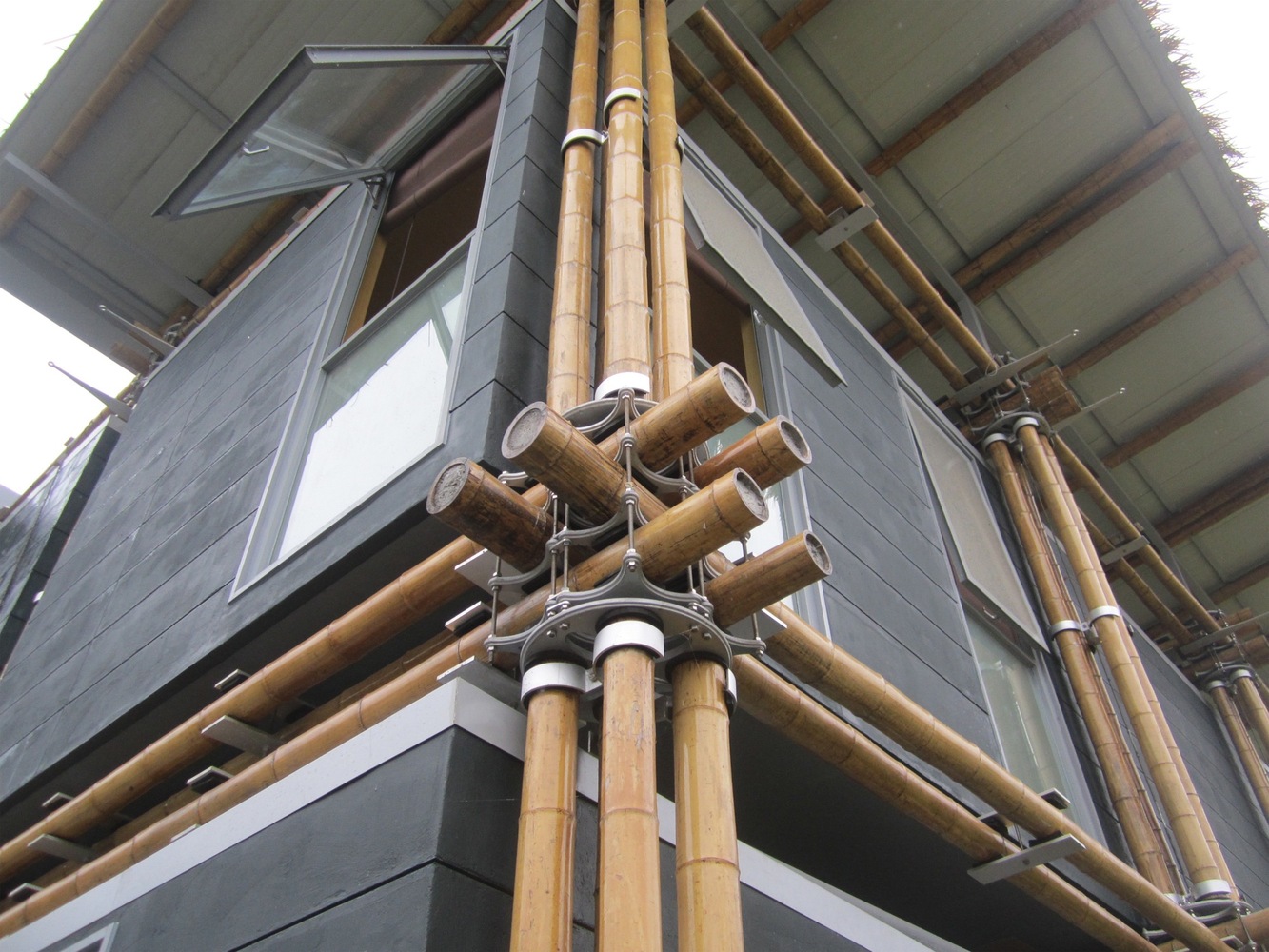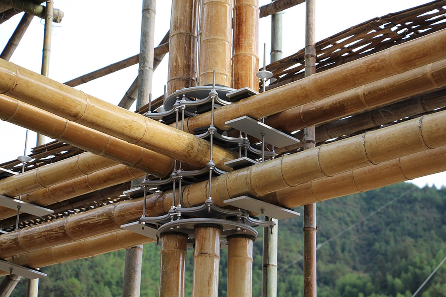 设计干式连接,不要通过穿孔削弱竹子,也不要用混凝土填充竹子,还可以根据需要更换竹杆;
