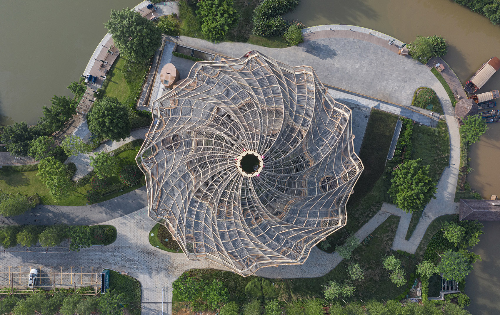 该项目设计灵感源自于古劳水乡荷塘水道的行船体验。炎炎夏日,在荷叶丛中看着风吹荷动,感受着微风拂面,轻松惬意。古劳水乡宾客中心,立体化抽象了荷叶褶皱的肌理,为四方宾客营造了驻足停留、远眺西江,以及放松冥想的公共休憩空间。